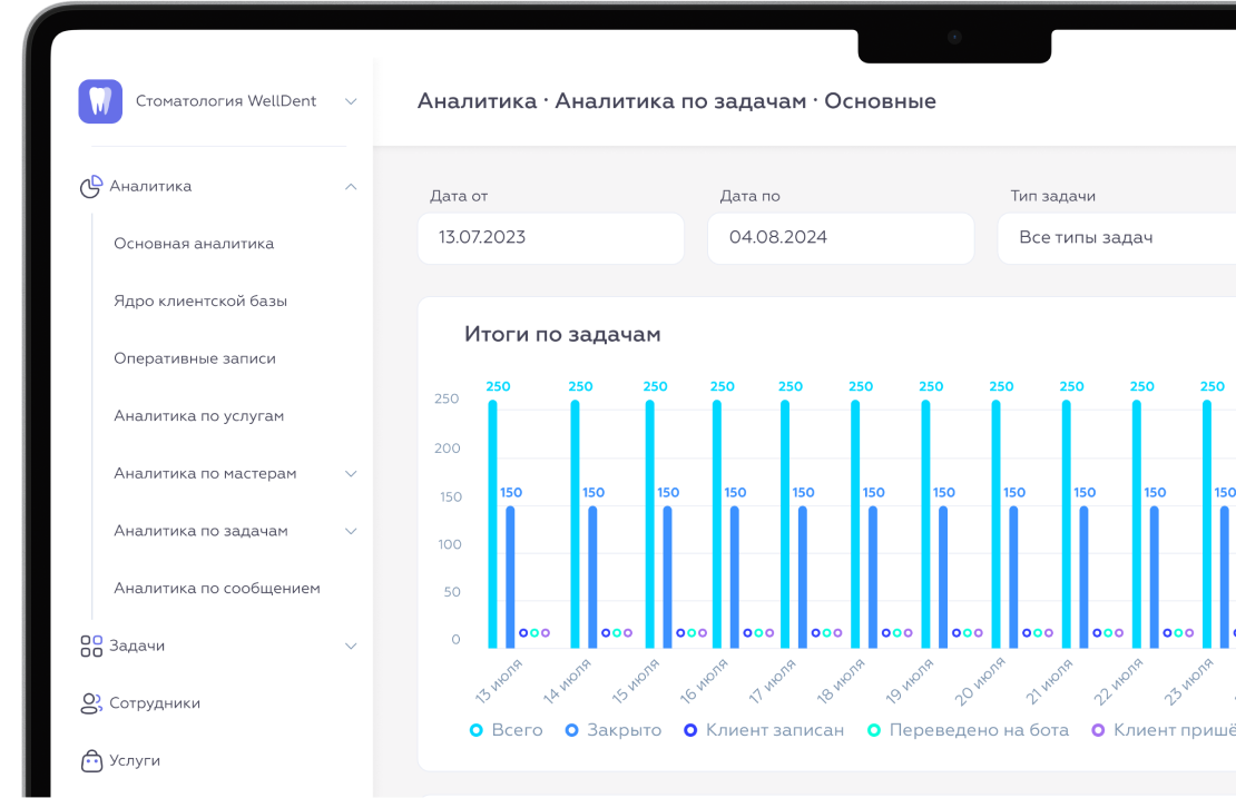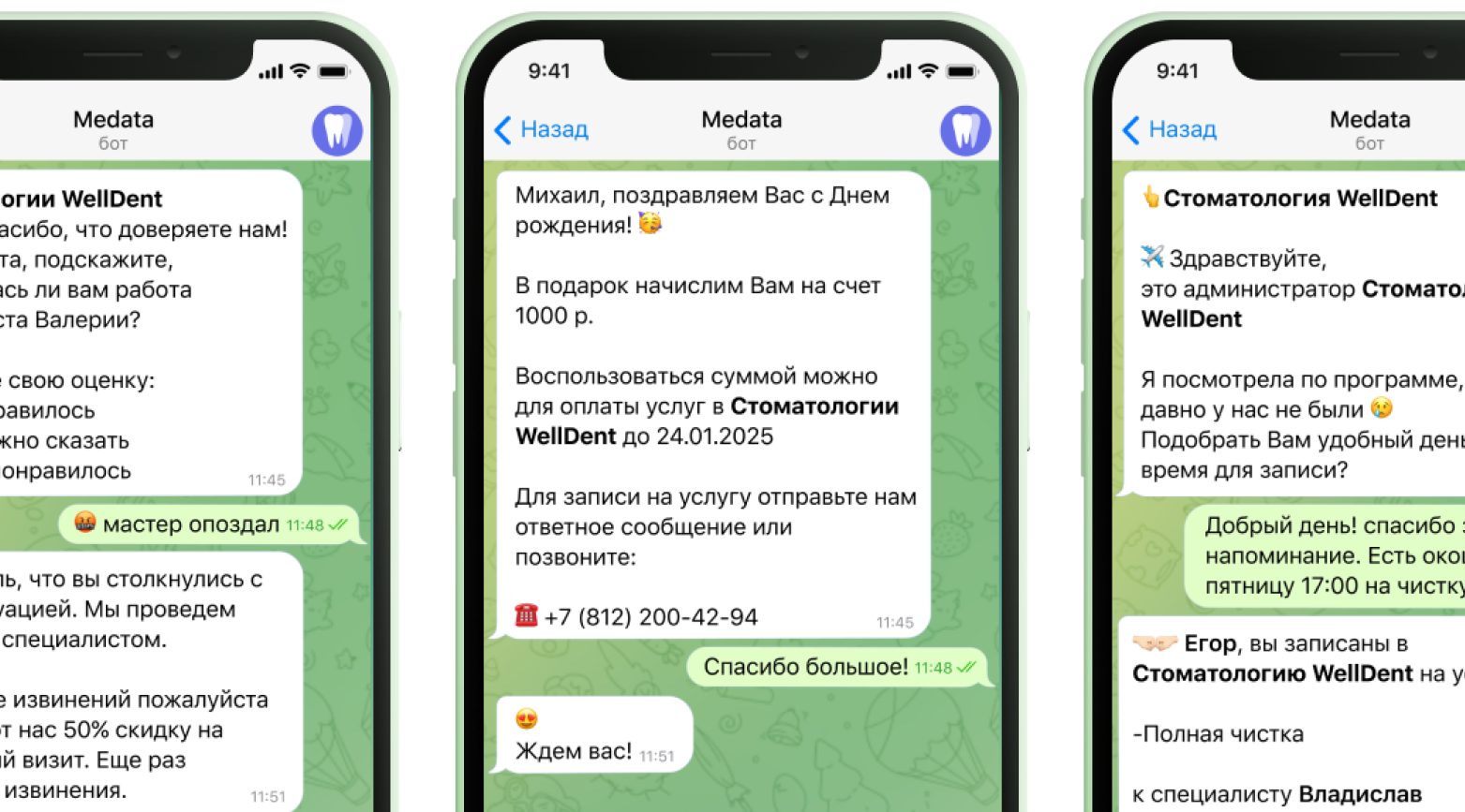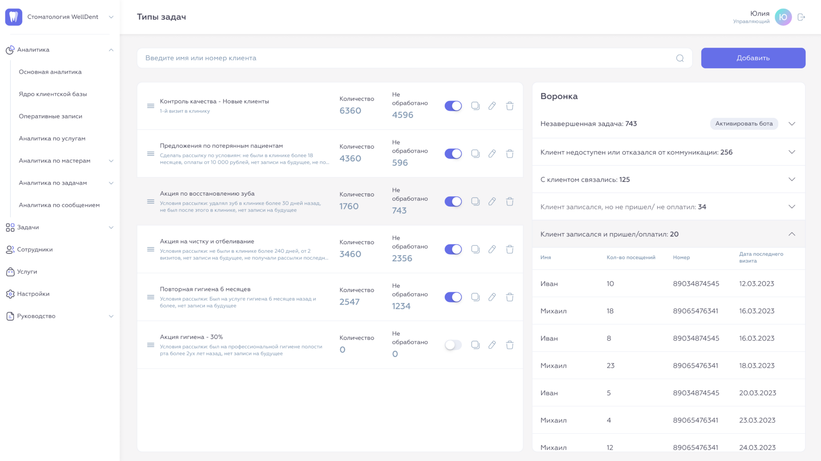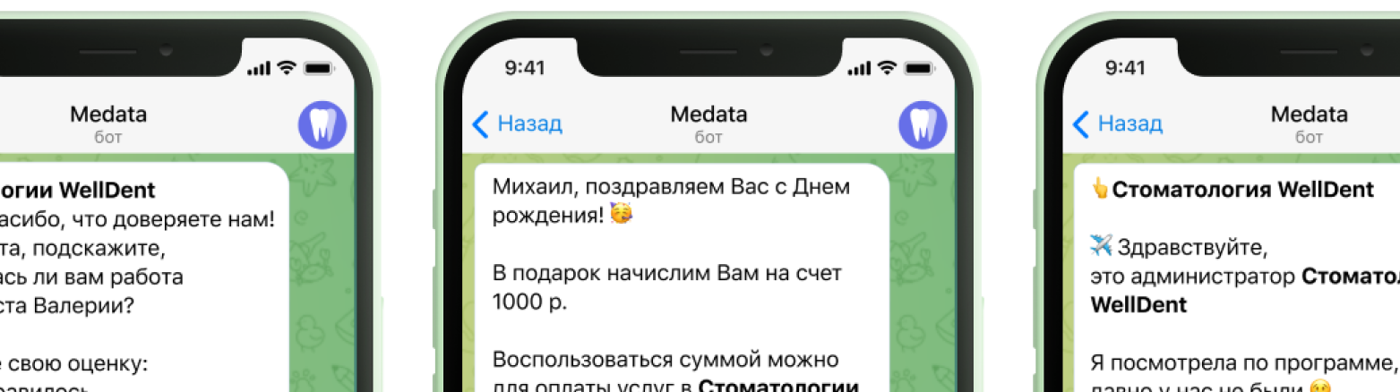 С помощью Medata создайте автоматизированные задачи для возврата клиентов. Система сама отсегментирует вашу базу и разошлет сообщения только релевантным клиентам (например, пригласит на Профгигиену клиентов, которые были на этой услуге более 6 месяцев)