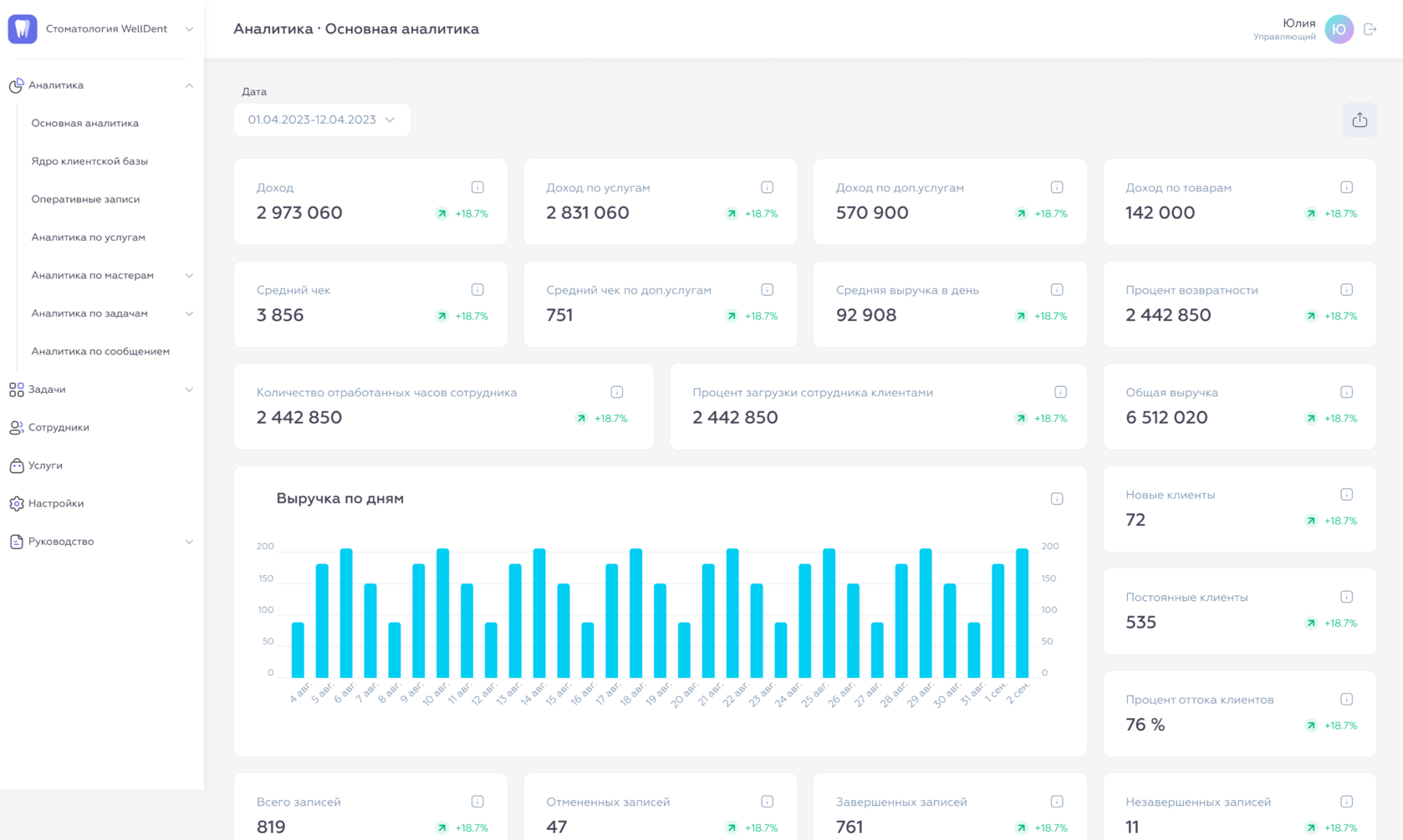 Medata проанализирует вашу клинику по ключевым параметрам: общая выручка, выручка в разрезе специалистов, средний чек в разрезе врачей, после каких специалистов клиенты уходят из клиники, динамика роста новых и постоянных клиентов, услуги, на которые клиенты чаще возвращаются